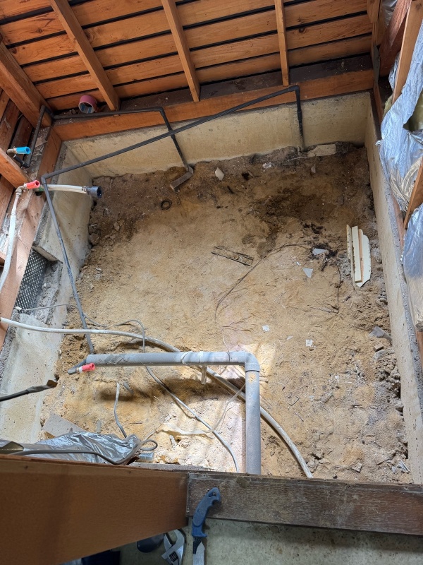 新しいユニットバスを設置する前に、下地の補修や給排水配管の確認・調整を行いました。